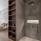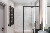 Nowoczesna łazienka z zardzewiałym stylu ściany pod prysznicem, szare płytki i stylowe szczegóły