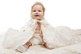 Urocza szczęśliwa dziewczyna w żółtej sukience i wstążce z kokardą na głowie w ramionach matek bawiących się w naturze na tle białego koca. Przestrzeń kopiowania.