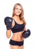 młoda kobieta lekkoatletycznego w Rękawice bokserskie na biały