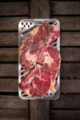 Trzy kawałki steków z surowych żeberek na drewnianym tle