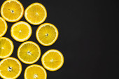 Widok z góry na jasne i smaczne pomarańcze odizolowane na czarno