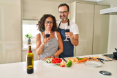 Latynoska para w średnim wieku gotuje i wylewa wino na szkło w kuchni