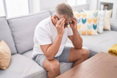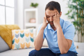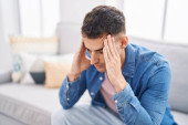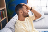 Afrykański Amerykanin zestresowany siedząc na kanapie w domu