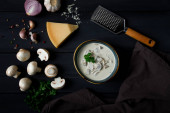 Tradycyjne gruzińskie danie, przystawka, pieczarki nadziewane, ser Sulguni, pieczony na glinianej patelni Ketzi, na drewnianym stole, zbliżenie, brak osób,