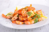 Krewetki na czarnym talerzu. Gotowane krewetki, krewetki. Żywność morska.