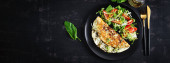 Naleśniki, cienkie naleśniki lub blini z kiwi i bananem w czarnym talerzu. Tydzień naleśników. Szrovetide. Widok z góry, powyżej