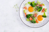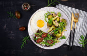 Angielskie śniadanie - smażone jajka, ser, ogórek, oliwki i szpinak. Amerykańskie jedzenie. Widok z góry, nad głową