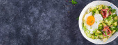 Kanapki z łososiem, jajkami i awokado. Keto, ketogenne śniadanie dietetyczne lub lunch. Widok z góry, baner