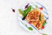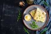 Zdjęcie "Naleśniki, cienkie naleśniki lub blini z kiwi i bananem w czarnym talerzu. Tydzień naleśników. Szrovetide. Widok z góry, powyżej" może być wykorzystywane do celów osobistych i komercyjnych zgodnie z warunkami zakupionej licencji Royalty-free. Obraz jest dostępny do pobrania w jakości wysokiej rozdzielczości do 5760x3840.