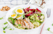 Zdjęcie "Wegetariańska sałatka warzywna z rzodkiewki, ogórków, awokado i jogurtu. Zdrowe wegańskie jedzenie." może być wykorzystywane do celów osobistych i komercyjnych zgodnie z warunkami zakupionej licencji Royalty-free. Obraz jest dostępny do pobrania w jakości wysokiej rozdzielczości do 5760x3840.