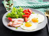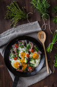 Smażone jajko ze szparagami, pomidorem i bekonem. Przydatne śniadanie. Widok z góry, nad głową