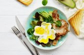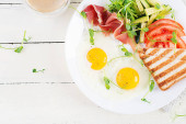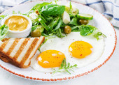 Angielskie śniadanie - smażone jajka, ser, ogórek, oliwki i szpinak. Jedzenie amerykańskie.