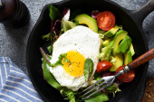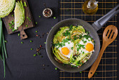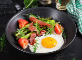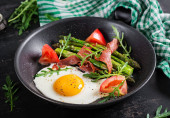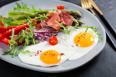 Zdjęcie "Jajka smażone ze szparagami, porami, szpinakiem i grzybami. Przydatne śniadanie." może być wykorzystywane do celów osobistych i komercyjnych zgodnie z warunkami zakupionej licencji Royalty-free. Obraz jest dostępny do pobrania w jakości wysokiej rozdzielczości do 5760x3840.