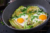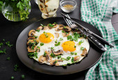 Jajka smażone ze szparagami, porami, szpinakiem i grzybami. Przydatne śniadanie.