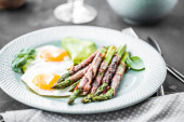 Smażone jajko ze szparagami, pomidorem i bekonem. Przydatne śniadanie.