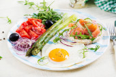 Zdjęcie "Smażone jajko ze szparagami, pomidorem i bekonem. Przydatne śniadanie." może być wykorzystywane do celów osobistych i komercyjnych zgodnie z warunkami zakupionej licencji Royalty-free. Obraz jest dostępny do pobrania w jakości wysokiej rozdzielczości do 5760x3840.