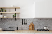 Zdjęcie "Wnętrze przytulnej kuchni z białą cegły ściany i zakres hod" może być wykorzystywane do celów osobistych i komercyjnych zgodnie z warunkami zakupionej licencji Royalty-free. Obraz jest dostępny do pobrania w jakości wysokiej rozdzielczości do 5760x3840.