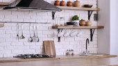 Wnętrze przytulnej kuchni z białą cegły ściany i zakres hod i świeże owoce
