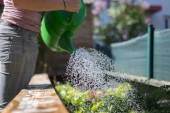 Zdjęcie "Ogrodnictwo miejskie: Alternatywna kobieta podlewająca świeże warzywa i zioła na owocnej glebie we własnym ogrodzie, podniesione łóżko." może być wykorzystywane do celów osobistych i komercyjnych zgodnie z warunkami zakupionej licencji Royalty-free. Obraz jest dostępny do pobrania w jakości wysokiej rozdzielczości do 5760x3840.