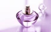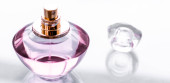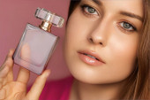 Perfumy, kosmetyki i kosmetyki modelka portret twarzy na różowym tle, piękna kobieta trzymająca butelkę perfum z kwiatowym zapachem kobiecym, koncepcja mody i makijażu