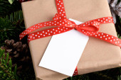 Boże Narodzenie kraft prezenty pudełko z czerwoną wstążką na rustykalnym drewnianym tle, Boże Narodzenie tło z naturalnych gałązek jodły, szyszki, Przytulne Boże Narodzenie martwa natura, urodziny lub nowy rok