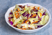 Domowej roboty Coleslaw z kapustą i marchewką w misce, widok z góry. Płaskie ułożenie, nad głową, z góry.