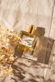 Przezroczysta butelka perfum z etykietą. Torba na zakupy i kapelusz na beżowym tle. Prezentacja zapachu przy świetle dziennym. Koncepcja trendu w naturalnych materiałach z żółtymi kwiatami polnymi. Esencja kobiet i mężczyzn.