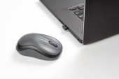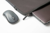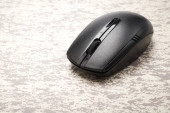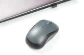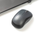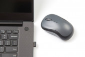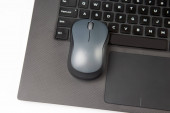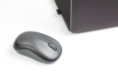 Bezprzewodowa mysz komputerowa obok laptopa na białym stole. elektroniczny przemysł osobisty
