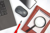 Bezprzewodowa mysz komputerowa, długopis i notatnik obok laptopa na białym stole z bliska. Przedmioty do prac biurowych