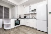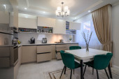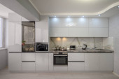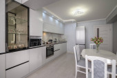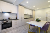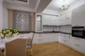 Zdjęcie "Wnętrze białej modnej nowoczesnej kuchni ze stołem jadalnym" może być wykorzystywane do celów osobistych i komercyjnych zgodnie z warunkami zakupionej licencji Royalty-free. Obraz jest dostępny do pobrania w jakości wysokiej rozdzielczości do 5760x3840.