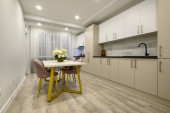 Wnętrze białej modnej nowoczesnej kuchni ze stołem jadalnym