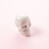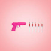Różowy pistolet na różowym pastelowym tle z różową czaszką i czerwonymi sercami. Minimalna koncepcja miłości.