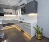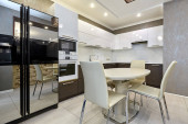 Wnętrze dobrze zaprojektowanej nowoczesnej białej kuchni, schowane szuflady