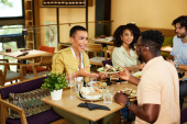 Mała międzyrasowa grupa przyjaciół siedzi w restauracji i je kolację..