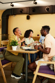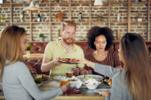 Wielokulturowa grupa przyjaciół je kolację w restauracji..