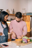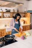 Szczęśliwy dorosła kobieta za pomocą cięcia warzyw w kuchni w domu i uśmiech.
