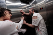 Strasznie wyglądające nieumarłe zombie z krwawymi ranami próbujące wejść do biura. Apokaliptyczne potwory pożerające mózg, szukające nowych ofiar, pocierające twarze o szklane drzwi..