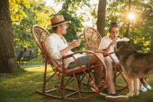 Zdjęcie "Młoda stylowa para pije drinka siedząc razem z psem na trawniku w pięknym ogródku wiejskiego domu. Młody mężczyzna i kobieta spędzają lato" może być wykorzystywane do celów osobistych i komercyjnych zgodnie z warunkami zakupionej licencji Royalty-free. Obraz jest dostępny do pobrania w jakości wysokiej rozdzielczości do 5760x3840.