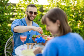 Zdjęcie "Młoda stylowa para prowadzi romantyczną rozmowę podczas spaceru z drinkiem na swoim pięknym podwórku wiejskiego domu. Młody mężczyzna i kobieta spędzają lato szczęśliwie" może być wykorzystywane do celów osobistych i komercyjnych zgodnie z warunkami zakupionej licencji Royalty-free. Obraz jest dostępny do pobrania w jakości wysokiej rozdzielczości do 5760x3840.