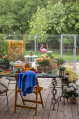 Widok na piękny i przytulny ogród ze stołem kawowym, fontanną i flamingiem