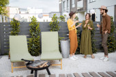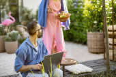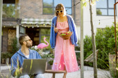 Zdjęcie "Młoda stylowa para spędza czas razem z drinkiem na swoim pięknym podwórku wiejskiego domu na łonie natury. Mężczyzna i kobieta spędzają lato na świeżym powietrzu" może być wykorzystywane do celów osobistych i komercyjnych zgodnie z warunkami zakupionej licencji Royalty-free. Obraz jest dostępny do pobrania w jakości wysokiej rozdzielczości do 5760x3840.