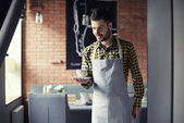 Kaukaski mężczyzna z zespołem Downa pokazuje menu do klienta