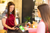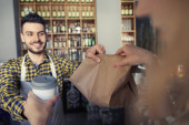 Kaukaski kelner z zespołem Downa przyjmujący bezdotykową zapłatę w kawiarni
