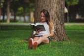 Uniwersytet dziewczyna siedzi w parku i czytanie książek