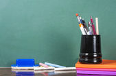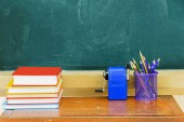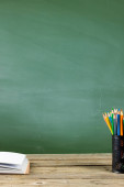 Obraz książek, notatnika i kredek na drewnianym stole nad czarną tablicą. Edukacja, uczenie się i kreatywność