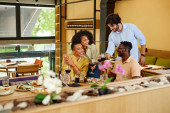 Zdjęcie "Afrykanin wznosi toast stojąc w restauracji z przyjaciółmi ze szklanką wina w rękach.." może być wykorzystywane do celów osobistych i komercyjnych zgodnie z warunkami zakupionej licencji Royalty-free. Obraz jest dostępny do pobrania w jakości wysokiej rozdzielczości do 5760x3840.