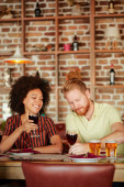 Afrykanin wznosi toast stojąc w restauracji z przyjaciółmi ze szklanką wina w rękach..