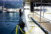 Zdjęcie "Piękny nowoczesny biały jacht jest zacumowany na molo morskim. Jacht i holowniki stoją na molo w morzu. Góry w tle." może być wykorzystywane do celów osobistych i komercyjnych zgodnie z warunkami zakupionej licencji Royalty-free. Obraz jest dostępny do pobrania w jakości wysokiej rozdzielczości do 5760x3840.