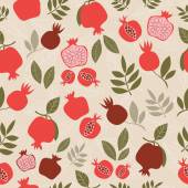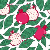 Dojrzałe czerwone granaty na gałęzi z zielonymi liśćmi. Płynny wzór z różowym tłem dla tekstyliów mody.