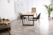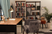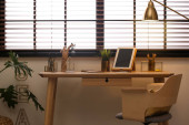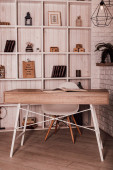 Drewniane stoły lęgowe w pobliżu rośliny i fotel w pokoju. Projekt wnętrza